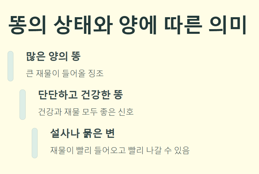 단단하고 건강한 상태의 똥을 보는 꿈은 건강과 재물 모두에 좋은 징조입니다. 반면, 설사나 묽은 변을 보는 꿈은 재물이 빠르게 들어오지만 그만큼 빨리 나갈 수 있음을 경고하는 신호일 수 있습니다.