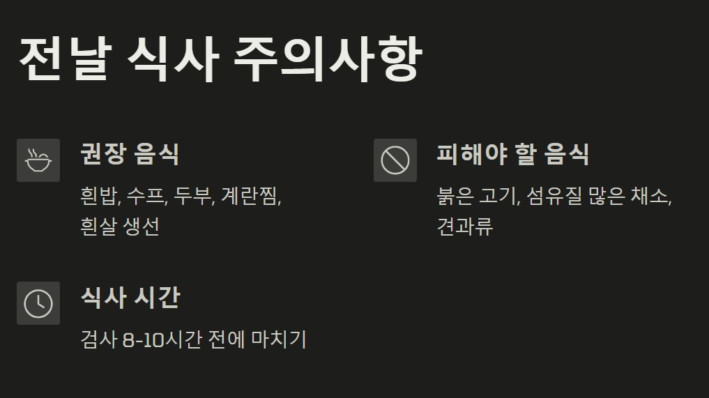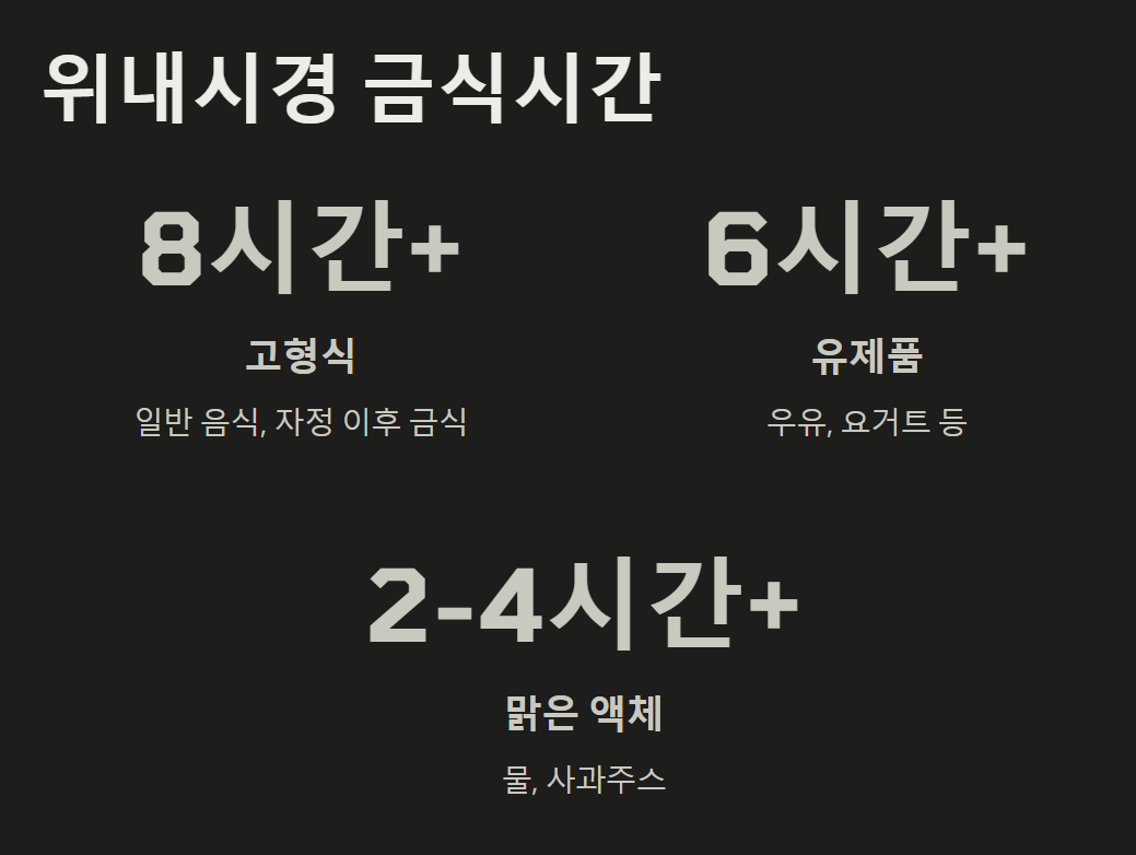- 고형식(일반 음식): 검사 전 8시간 이상