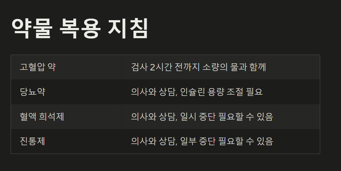 | 고혈압 약 | 가능 | 검사 2시간 전까지, 소량의 물과 함께 |