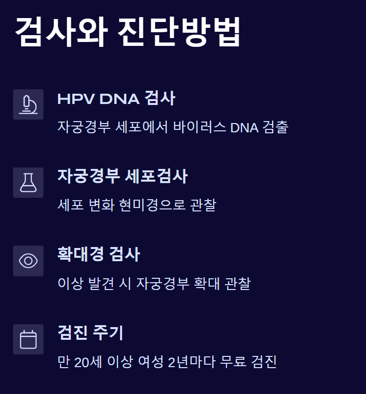 - 자궁경부 세포검사(Pap test): 자궁경부의 세포 변화를 현미경으로 관찰하여 HPV 감염으로 인한 이상 여부를 확인합니다.